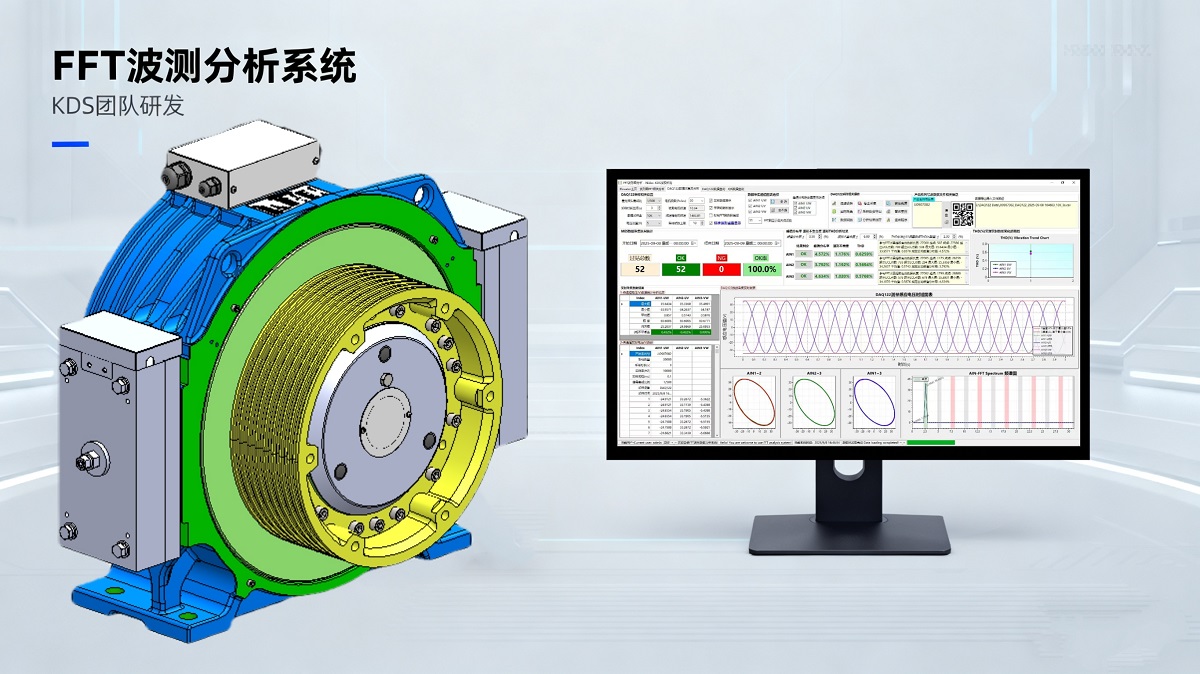 В областта на изпитването на производителността на тяговите машини конвенционалните методи включват основно изпитване на вибрации, изпитване на шума и т.н. Но точното улавяне на вълните на напрежението и анализирането на оперативните данни е в основата на преценката на състоянието на двигателя. След обширно усъвършенстване екипът на NIDEC Elevator Motor разработи независимо система за анализ на формата на вълната на FFT, базирана на принципа на обратната електродвижеща сила на тяговите машини — без необходимост от сложни външни сензори, тя може да генерира синусоиди само чрез преобразуване на сигнала, осигурявайки по-ефективно и точно решение за тестване на тягови машини.