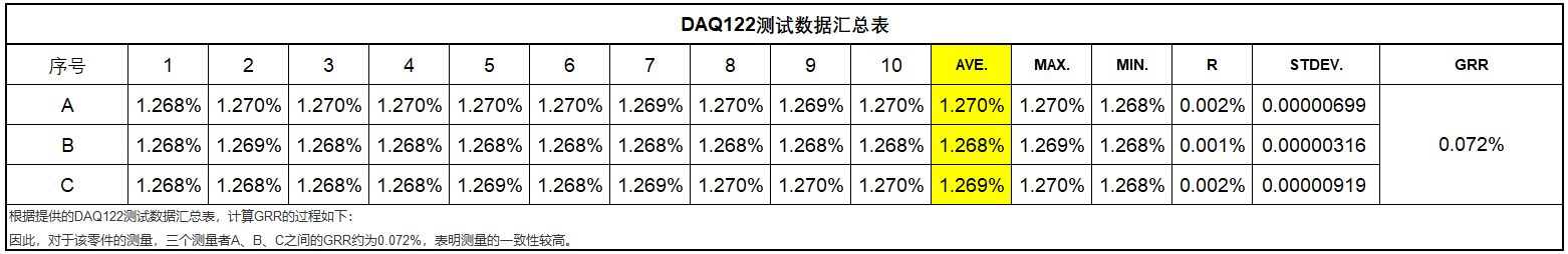 За да гарантира, че избраната карта за събиране на данни отговаря на изискванията, екипът на ME я тества. Анализът показва, че избраната карта за събиране на данни има отлична стабилност, с GRR от приблизително 0,072% сред три измервателни устройства A, B и C.