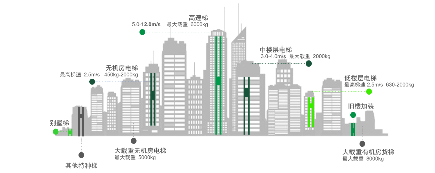 Ние предлагаме широка гама от тягови машини и съвпадащи мейнфрейми, подходящи за сценарии на приложение с максимална товароносимост от 6000 kg (съотношение 2:1) и максимална скорост от 12 m/s (съотношение 1:1). Клиентите могат директно да избират подходящи модели въз основа на параметрите на асансьора, което значително съкращава цикъла на проектиране.