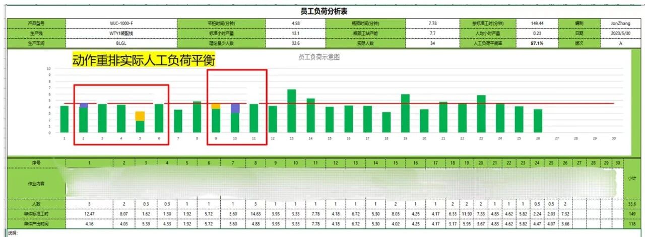 Степента на натоварване на служителите е основен елемент за подобряване на капацитета. Поради непоследователни времена на цикъла между процесите, действителната продукция беше сравнително ниска. Възползвайки се от опита, натрупан от предишни подобрения в балансирането на линията, отделът ME пое водеща роля в стимулирането на инициативи за увеличаване на степента на балансиране на работното натоварване на служителите в производствената линия. Чрез прилагане на принципа ECRS (елиминиране, комбиниране, пренареждане, опростяване) за оптимизиране на процесите, процентът на балансирано натоварване на служителите достигна над 82%.
