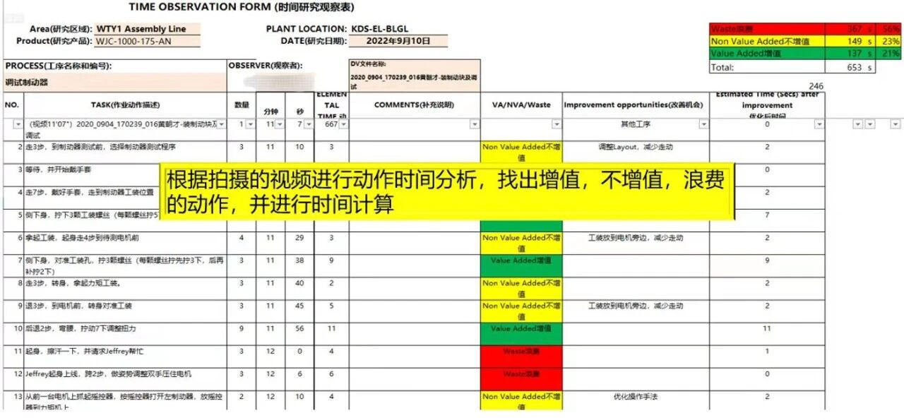 Като най-ранният систематичен инструмент за подобряване, въведен вътрешно, анализът на времето е натрупал солиден опит за подобряване. Той също така изигра пионерска роля в цялостното усъвършенстване на VSM – служейки както като продължение на предишни подобрения, така и като връзка към последващи подобрения, специфични за проекта. Екипите за подобрения назначиха специален персонал за заснемане на операциите на служителите при всеки процес в съответствие със стандартните принципи на работното време. Членовете на екипа и дори служителите на първа линия съвместно преглеждаха видеоклиповете многократно, разлагаха и анализираха работните движения и провеждаха колективна мозъчна атака, за да идентифицират възможностите за подобрение и да предложат предложения, като в крайна сметка формулираха план за подобрение.
