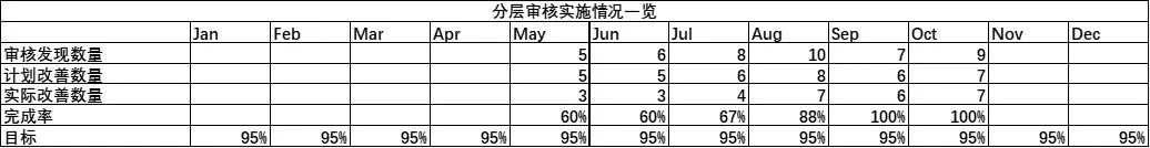 Съдържанието на слоести одити на процесите е обширно. За да се следи ефективността и качеството на одитите, действителното изпълнение на LPA се показва по начин, подобен на таблото за управление. Показаното съдържание включва: степента на изпълнение на изпълнението, броя на констатациите за одит, степента на завършване на подобренията и т.н.