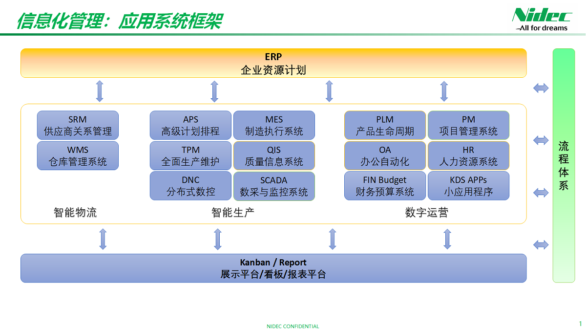 Nidec Elevator Motors е разработила независимо системи като SRM (Управление на взаимоотношенията с доставчиците), MES (Система за изпълнение на производството), APS (Разширено планиране и планиране), WMS (Система за управление на склада) и TPM (Обща продуктивна поддръжка). Той изгражда цялата интелигентна производствена система чрез автоматизация, дигитализация, моделиране, визуализация, интеграция и интелигентност, като дава възможност за реализиране на балансиран производствен график и гъвкаво интелигентно производство и полага солидна основа за бъдещата реализация на „фабрика за фарове“.