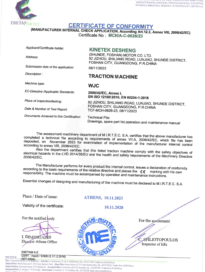 4. Сертифициране на ЕС (Сертифициране на СЕ за механичната директива на двигателите и сертифицирането на EN81 за спирачки): Покриване на всички серии от нашите модели като WJC/WTY1/WR/WTY2.