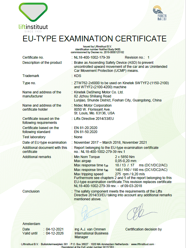 NIDEC Elevator Motors разполага с пълна и изчерпателна гама от сертификати за продукти, включително сертификати за тестови сертификати за специална екипировка и съответни сертификати за чуждестранни продукти, които могат напълно да отговорят на различните пазарни нужди на клиентите.